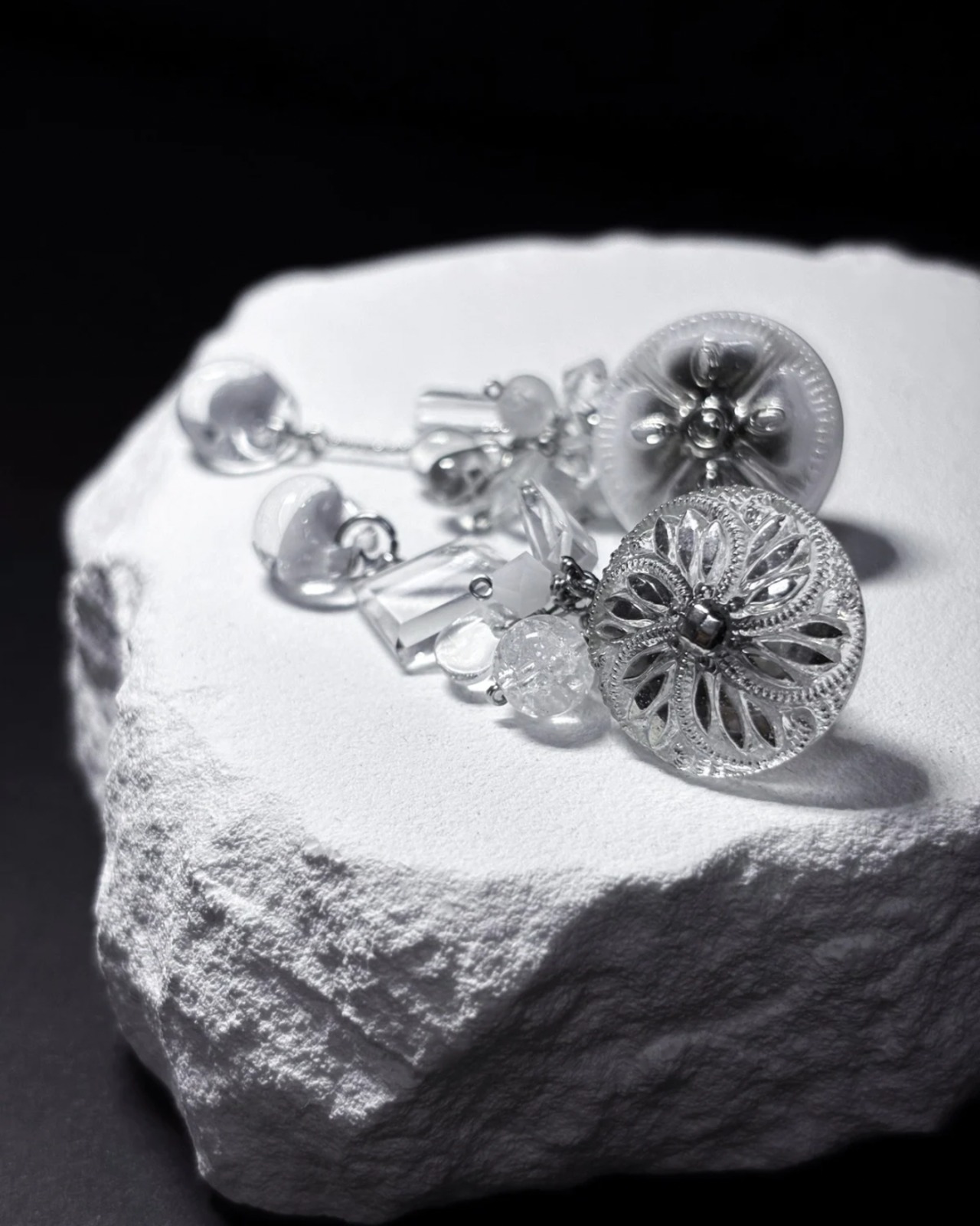 ヴィンテージガラスボタンと宝石質天然石、ガラスビーズを組み合わせ、【1点のみ】丁寧に仕立てています。