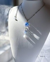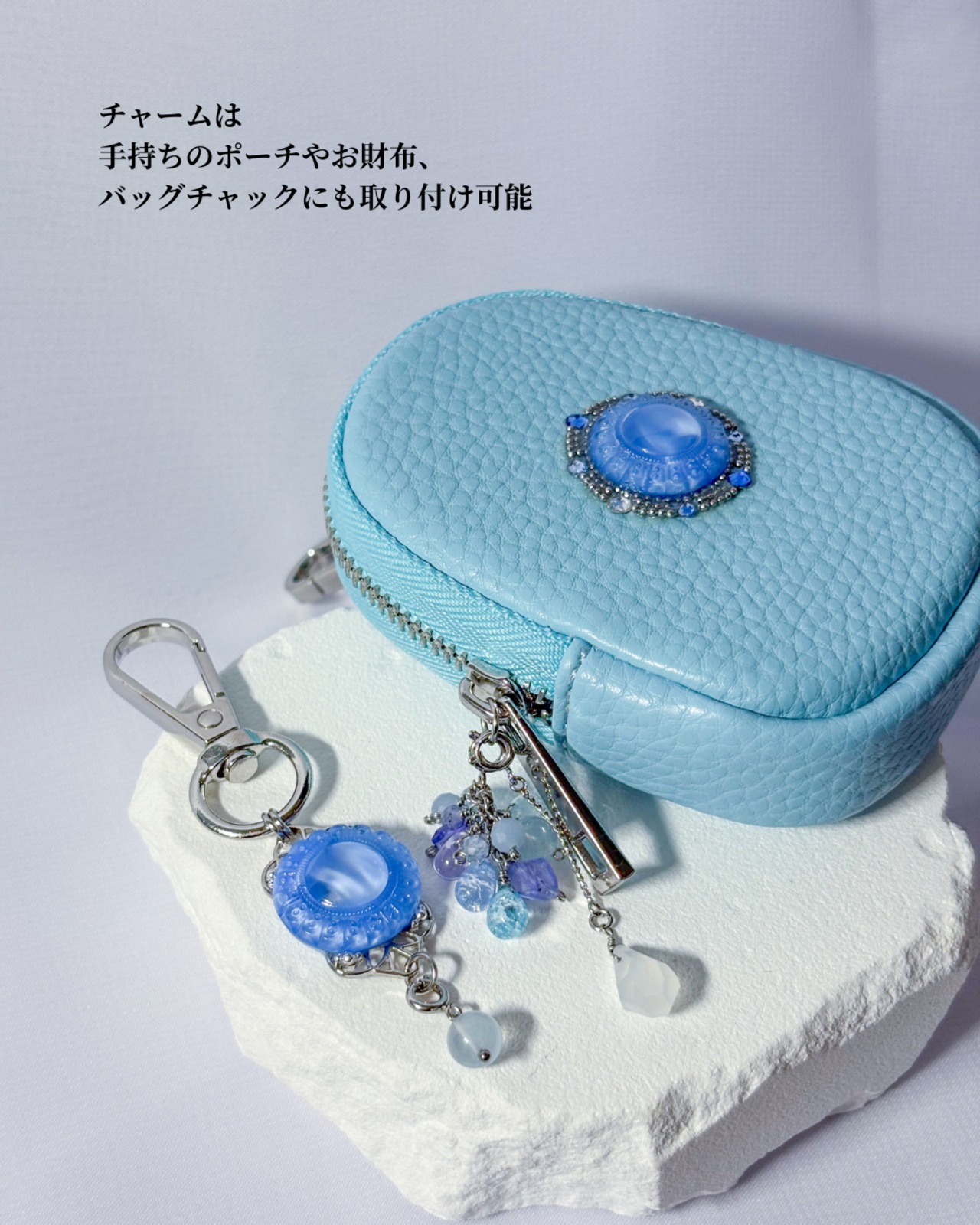 西ドイツ1960〜70年代ヴィンテージガラスボタン、タンザナイト、アクアマリン、水晶、スカイブルートパーズ、エンジェライト、アイスクォーツ、チェコガラスビーズ、メタルパーツ、ステンレスワイヤー、カラビナ、樹脂(ボタン裏加工)、メッキ加工チェーン(モチーフ部分)