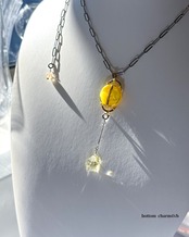 1950〜60年代西ドイツヴィンテージガラスボタン、レモン×スモーキークォーツ、ルチルクォーツ、レモンクォーツ、フローライト、シトリン、レインボームーンストーン、水晶、ゴールドコーティングヘマタイト、チェコガラスビーズ、メタルパーツ、ステンレスワイヤー、ステンレスチェーンネックレス、樹脂(ボタン裏加工)、メッキ加工チェーン(モチーフ部分)