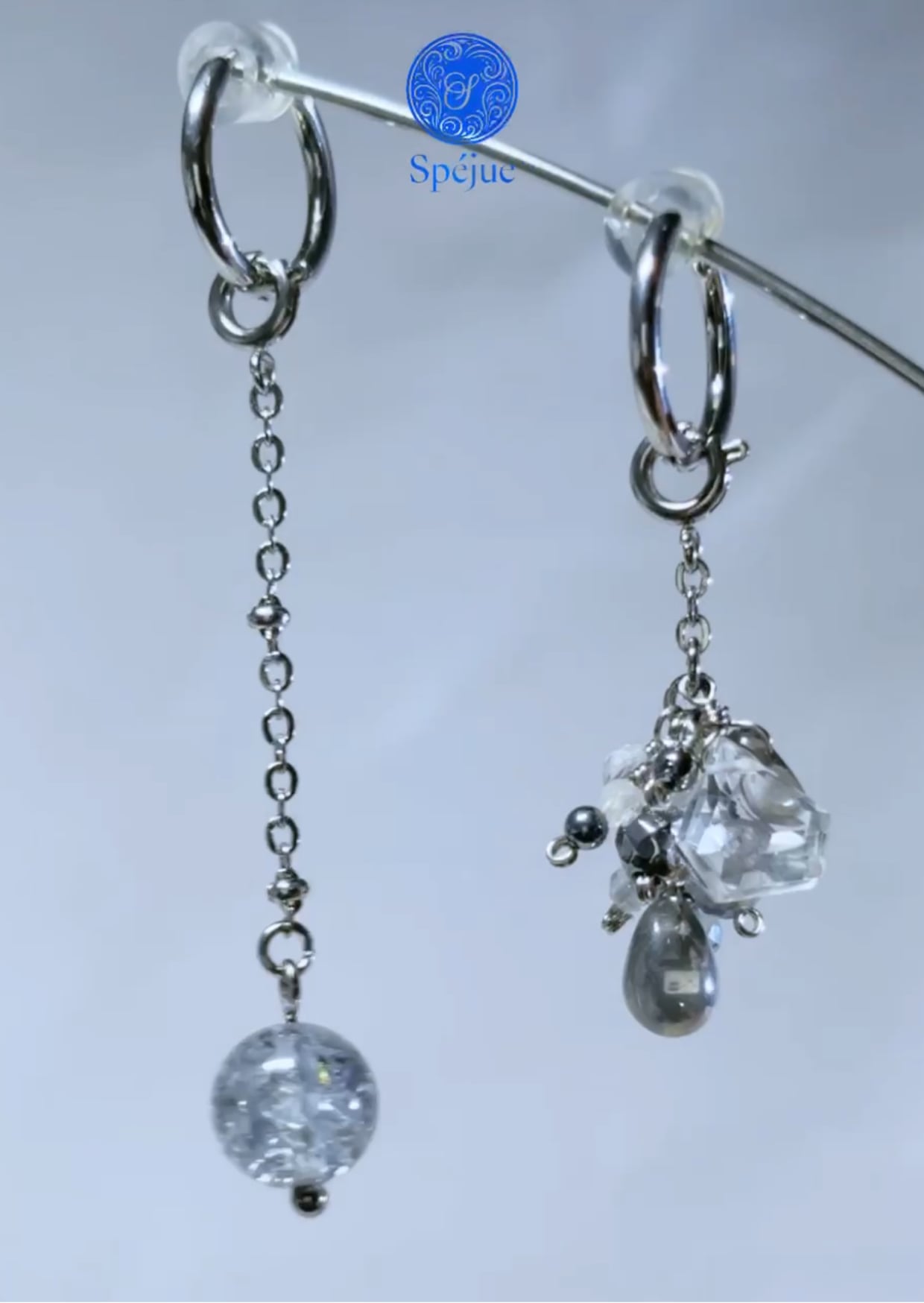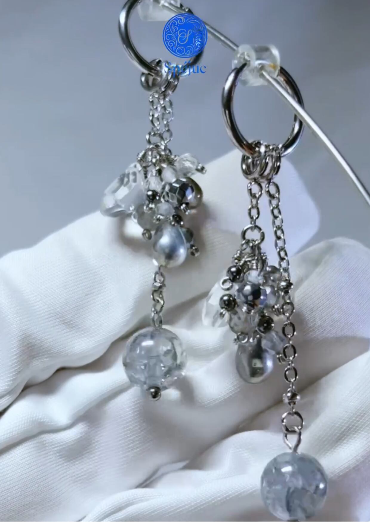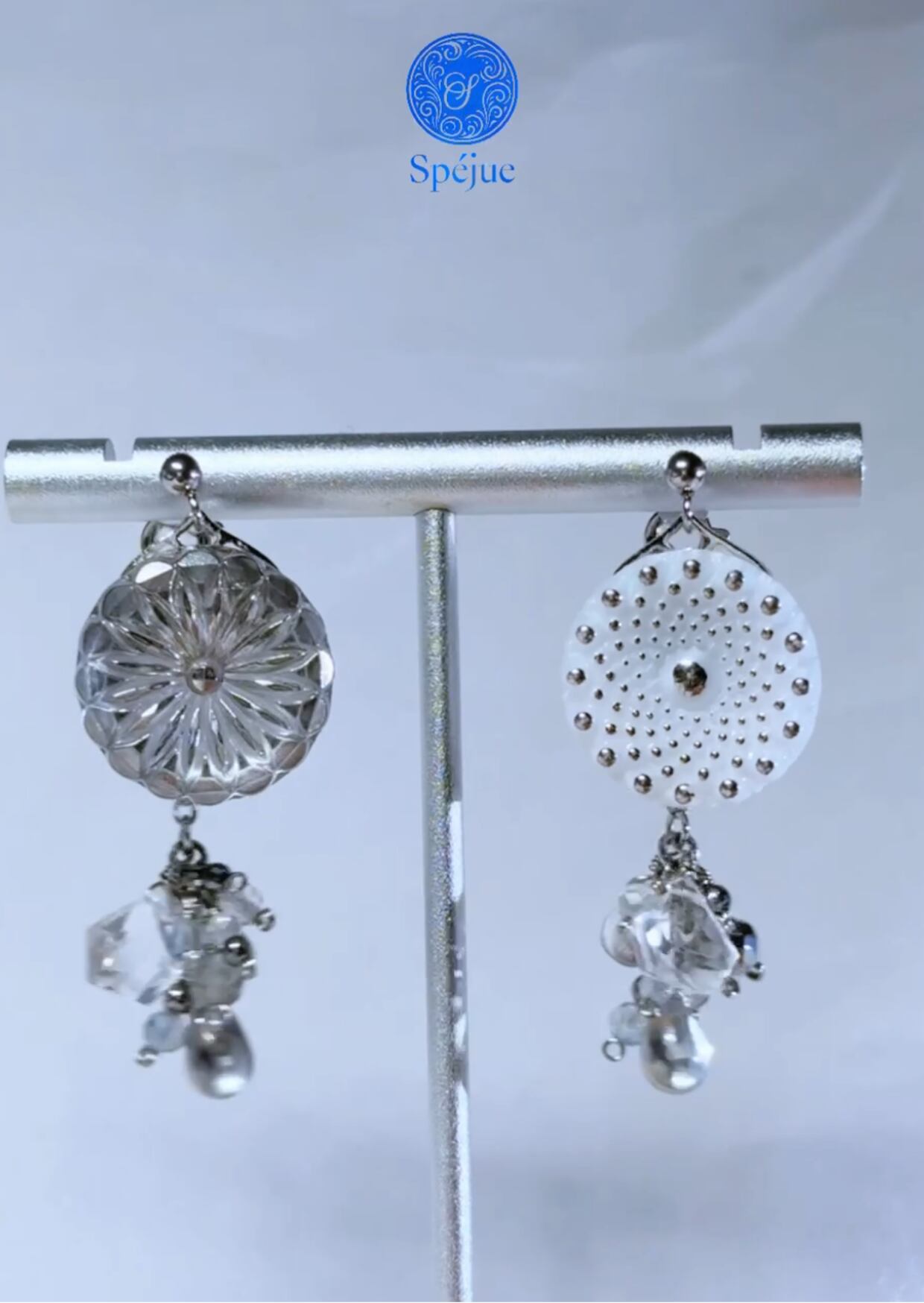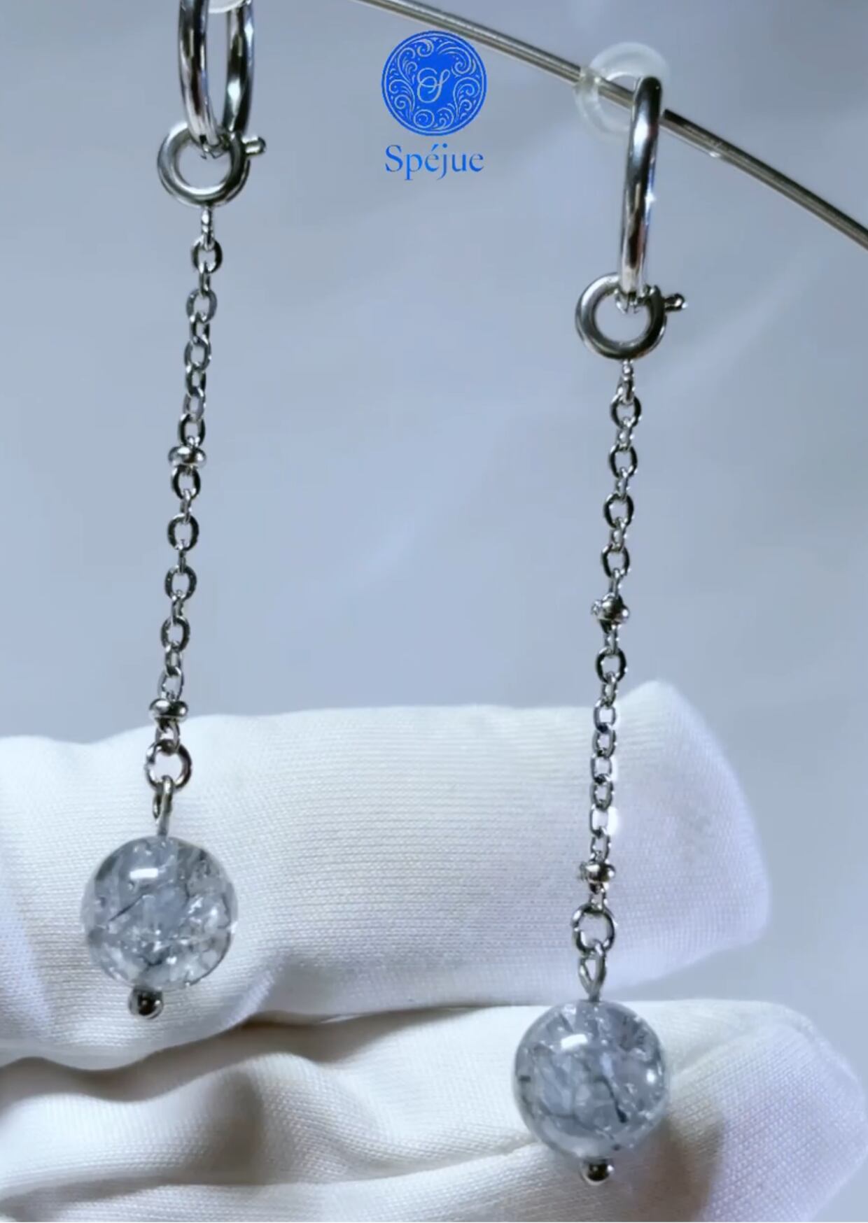 雪深い国の仕立て屋が、凍てつく銀の花と跳ねる光の粒子を繋ぎ合わせて作った耳飾り。