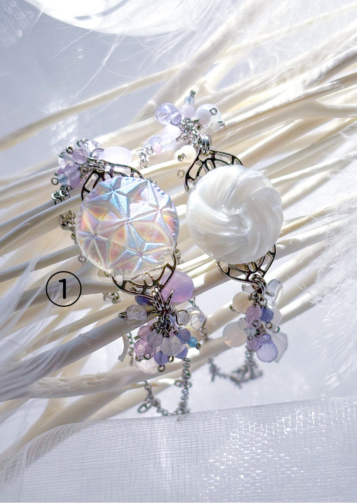チェコスロヴァキア時代アンティークガラスボタン、スコロライト、アイスクォーツ、レピドライト、タンザナイト、アクアマリン、ラベンダーアメシスト、ローズクォーツ、ブルーレース、マザーオブパール、チェコガラスビーズ、メタルパーツ、ステンレスワイヤー、ステンレスチェーン、樹脂(ボタン裏加工)