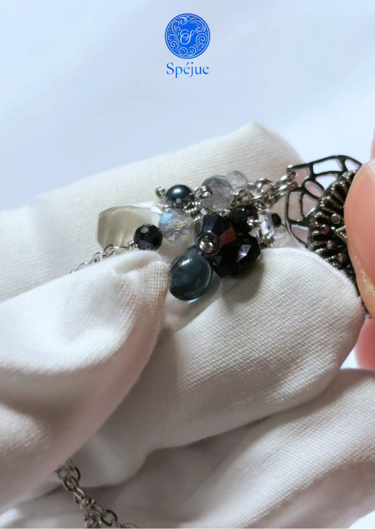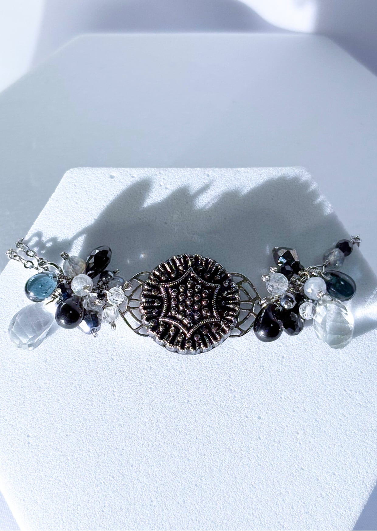 1960〜70年代西ドイツヴィンテージガラスボタン、水晶、ブラックスピネル、テラヘルツ、ラブラドライト、ハーキマーダイヤモンド、サファイア、シルバーフラッシュクリスタル、グレージルコン、ヴィンテージガラスビーズ、メタルパーツ、ステンレスワイヤー、ステンレスチェーン、樹脂(ボタン裏加工)