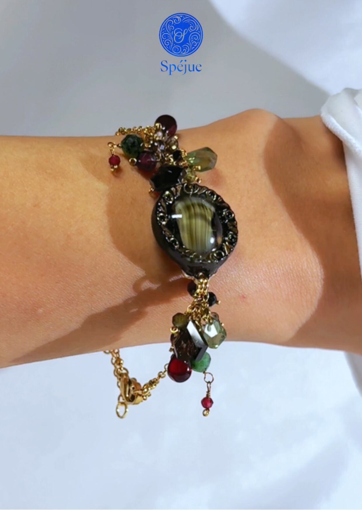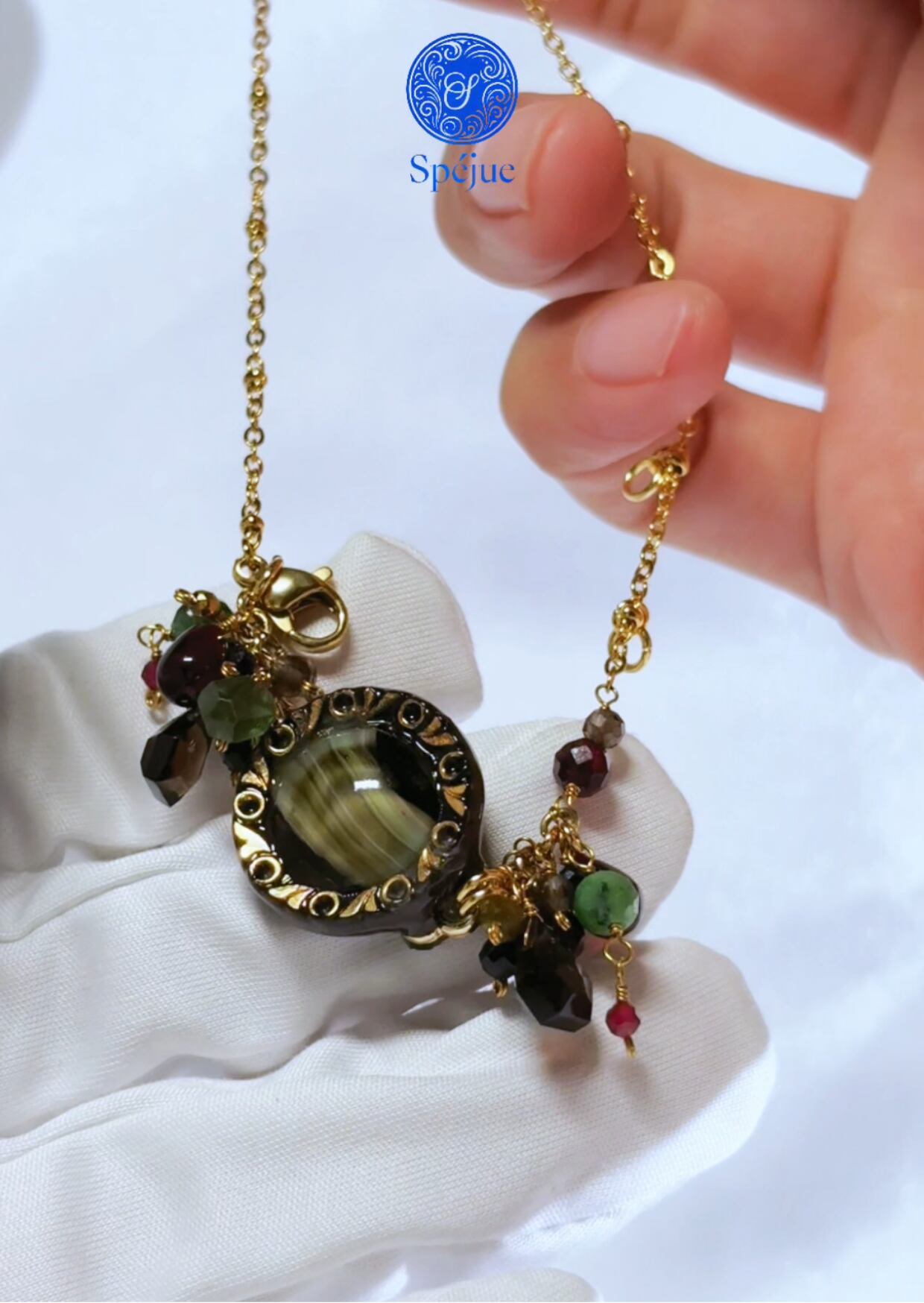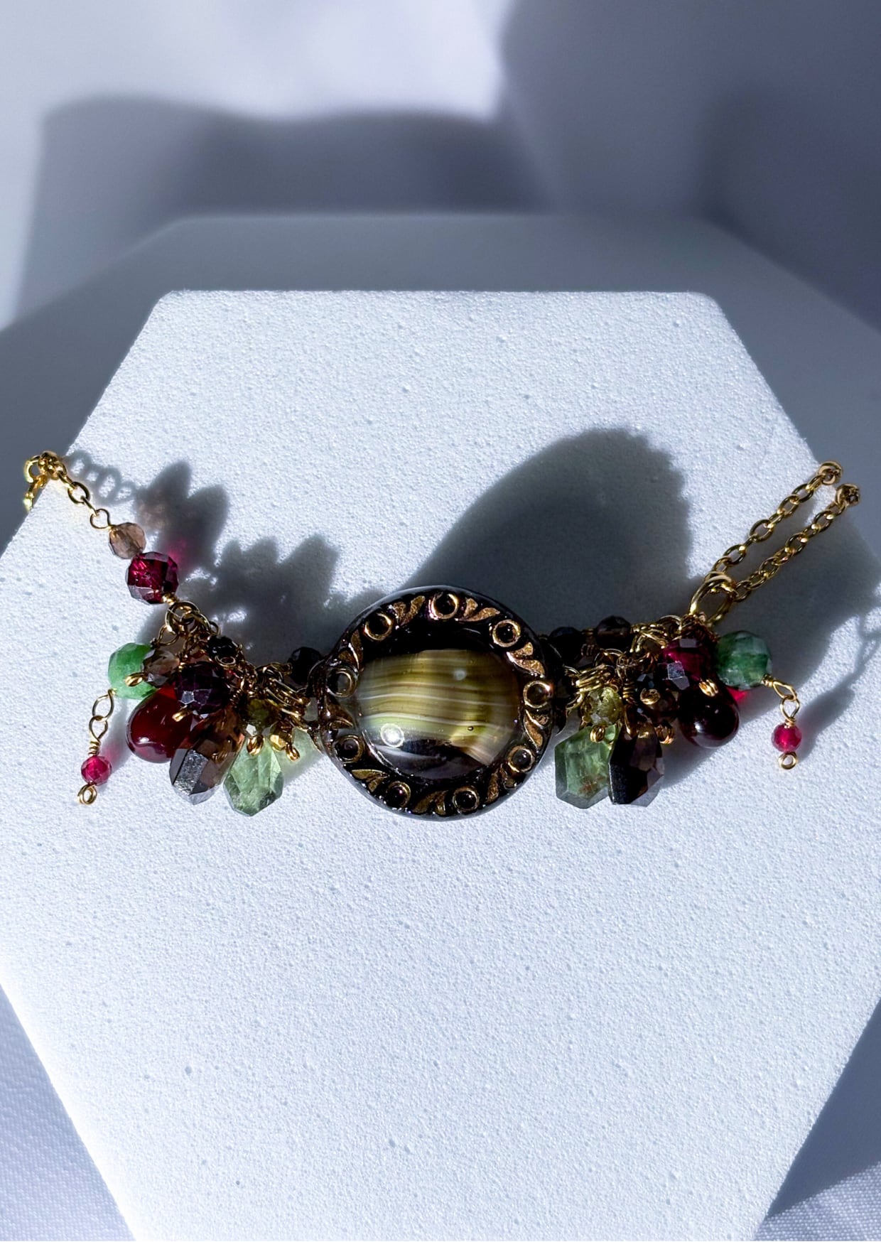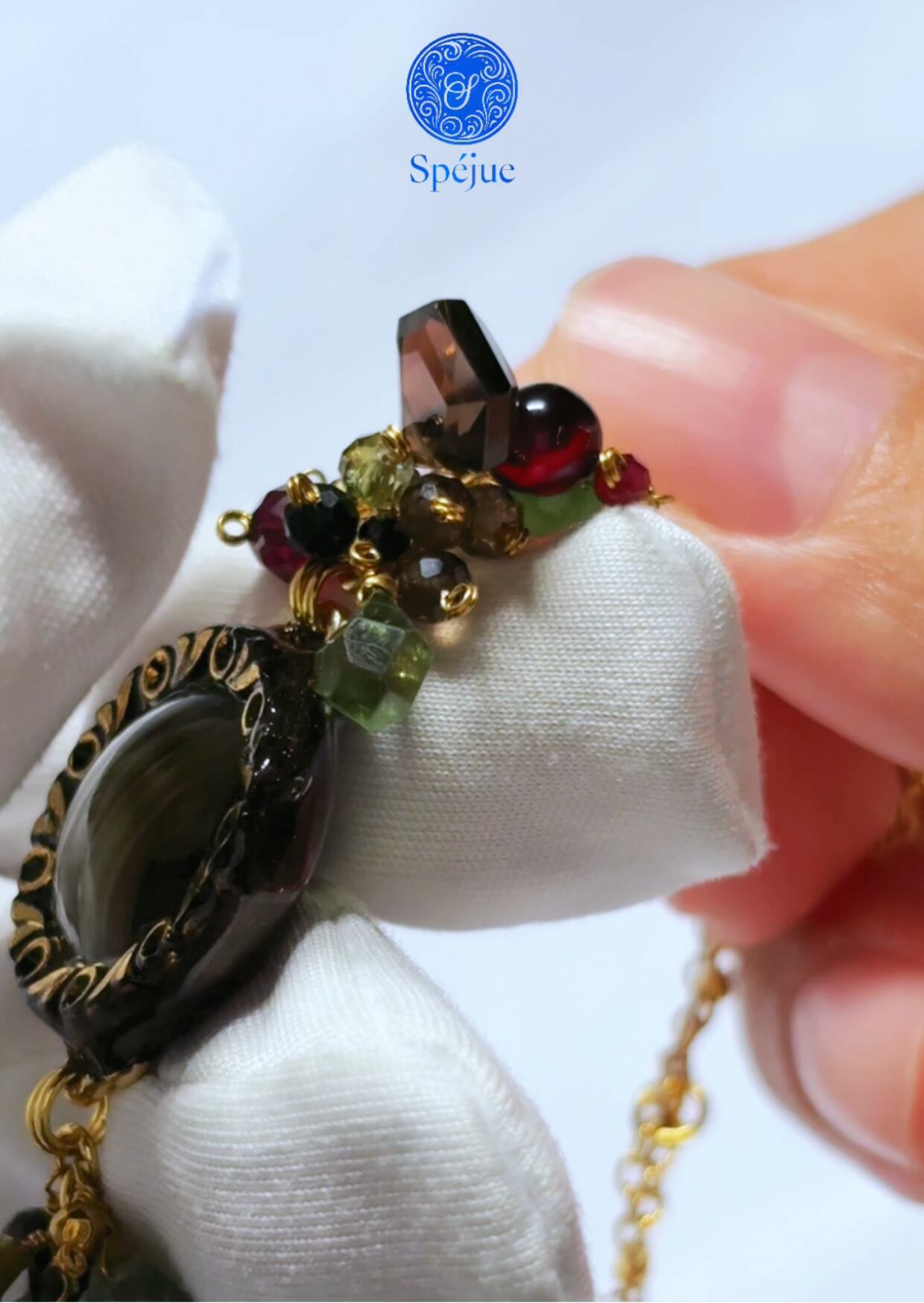 1960〜70年代西ドイツヴィンテージガラスボタン、グリーンアパタイト、ルビーインゾイサイト、グリーントルマリン、ロードライトガーネット、ブラックスピネル、スモーキークォーツ、ルビー、ゴールドコーティングヘマタイト、チェコガラスビーズ、メタルパーツ、ステンレスワイヤー(ニッケルフリーメッキ処理)、ステンレスチェーン(ニッケルフリーメッキ処理)、樹脂(ボタン裏加工)